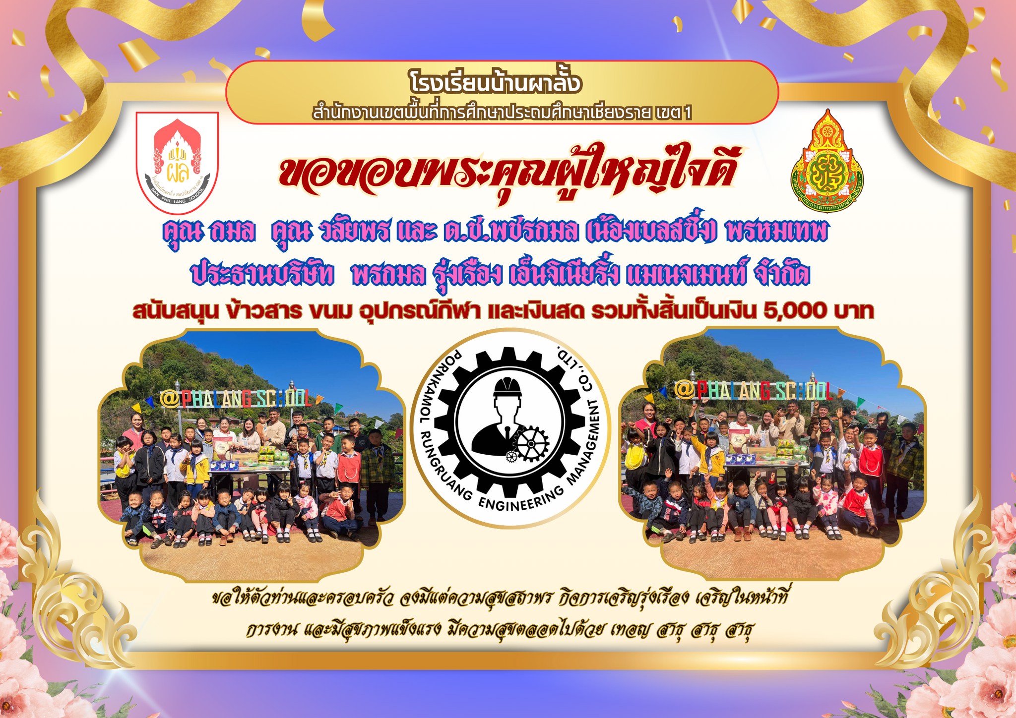 บริษัทพรกมล รุ่งเรือง เอ็นจิเนียริ่ง แมเน็จเมนท์ จำกัด มอบข้าวสาร ขนม อุปกรณ์กีฬา และเงินสดให้ทางโรงเรียน